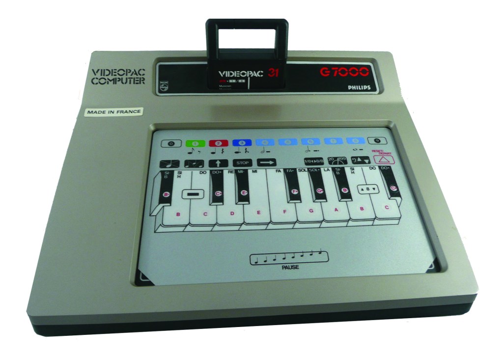 Ironically, the very-first piano add-on for a console had also been made out of cardboard. The Videopac Musician,which came out in 1982, was available for the Philips Videopac G7000, the European version of the Odyssey2. The keyboard was actually an overlay that sat atop the console’s built-in membrane keyboard.