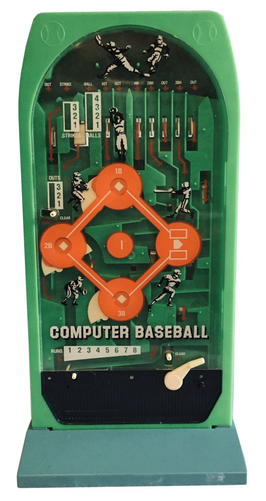 In 1976 Epoch Playthings imported Computer Baseball, which from its name would imply one of the company’s first electronic games. But the name was a misnomer. Computer Baseball was actually a pachinko-type game that stood nearly two feet high in which the object was to launch a ball from the bottom of the unit to the top, where it would then descend through several different paths that determined the play. The unit didn’t even need batteries.