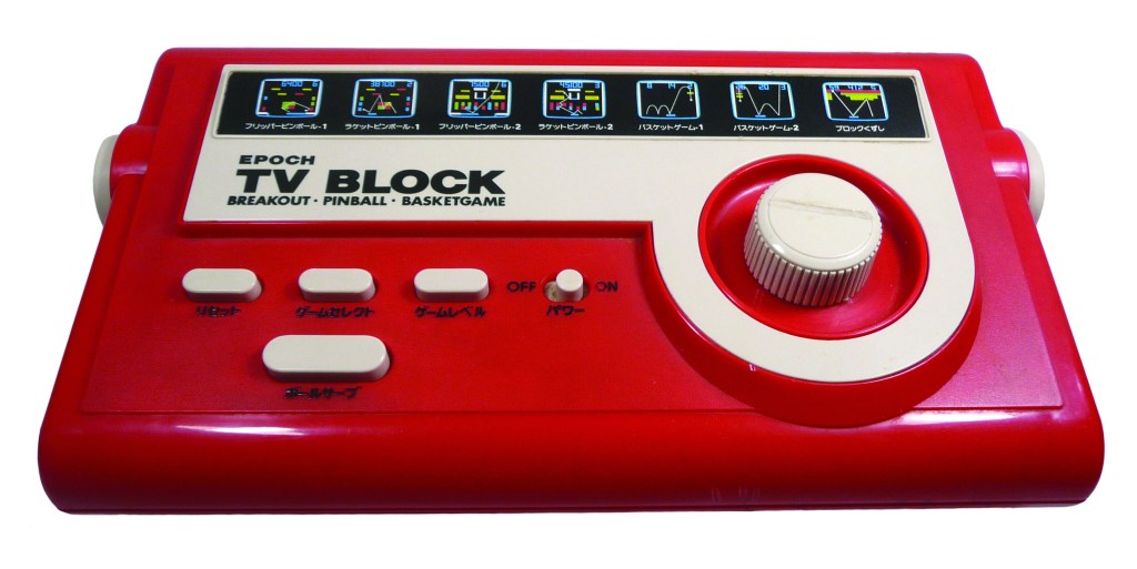 Epoch released its next console in May, 1979 and followed a different approach. The company purchased chips from Atari and built its own version of Atari’s Video Pinball, which it called TV Block. The layout of the game selections on the console, along with the paddle dial and the flipper buttons, were roughly in the same place as they were on the Atari units, but the console with its bright red plastic body couldn’t be mistaken for Atari’s model in any way. And while the audio from the Atari units was heard through the console’s speaker, Epoch went ahead and channeled the audio through the TV set.